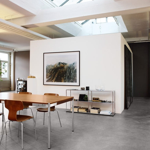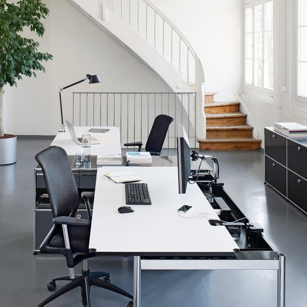 USM Haller table er en bordserie med spise, arbeids og salongbord. Bordene kommer i mange ulike størrelser og med et stort utvalg av bordplater. Serien kan leveres med ekstrautsyr som integrert skjermholder, USB uttak, strømsortering mm.